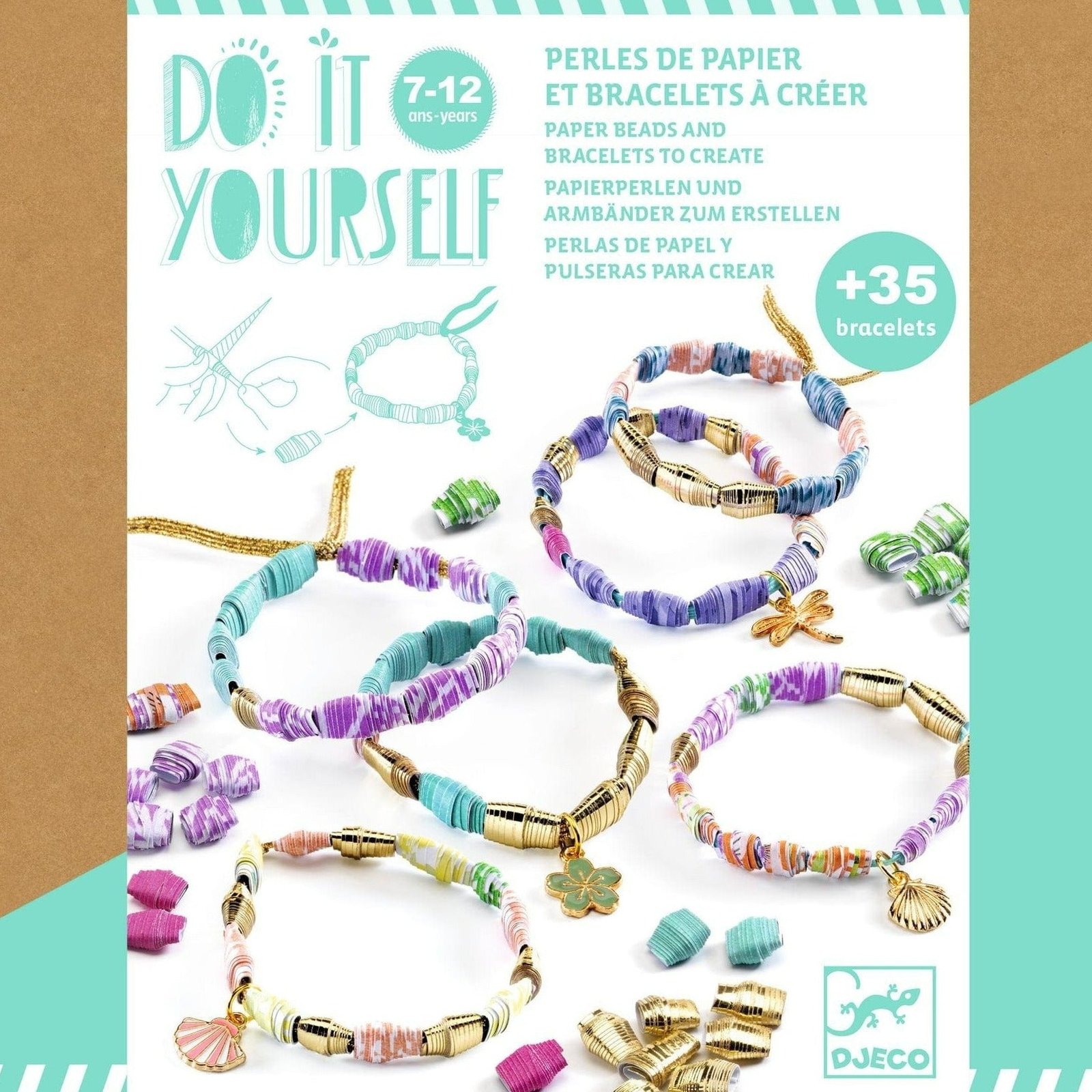 Increíble kit de arte y manualidades para crear todo tipo de pulseras de colores con cuentas de papel hechas a mano. Consiste en cortar las hojas estampadas en tiras, enrollarlas alrededor de un palo pegarlas. ¡Estas cuentas están listas para ser enhebradas en el cordón elástico para crear preciosas pulseras!