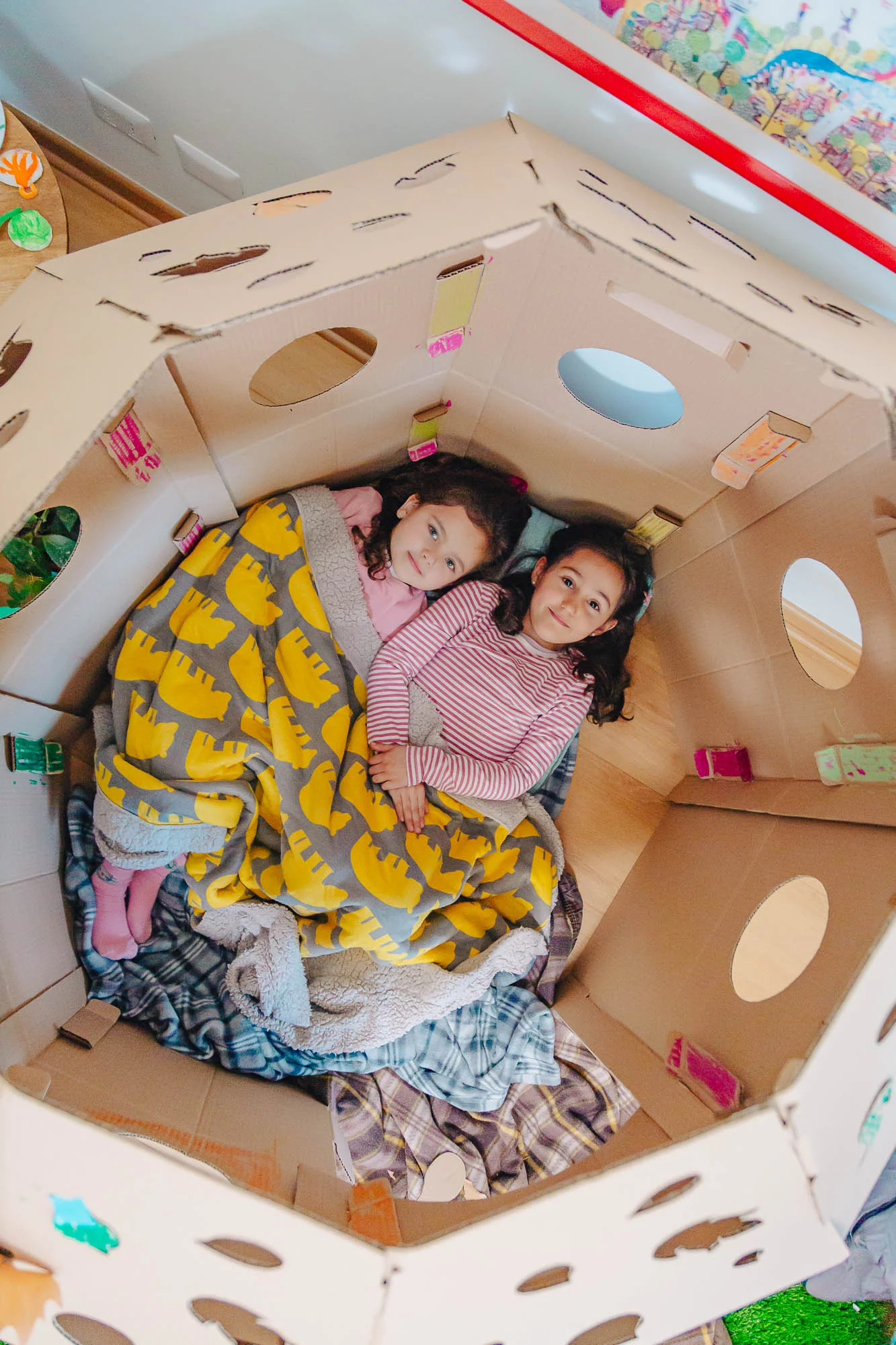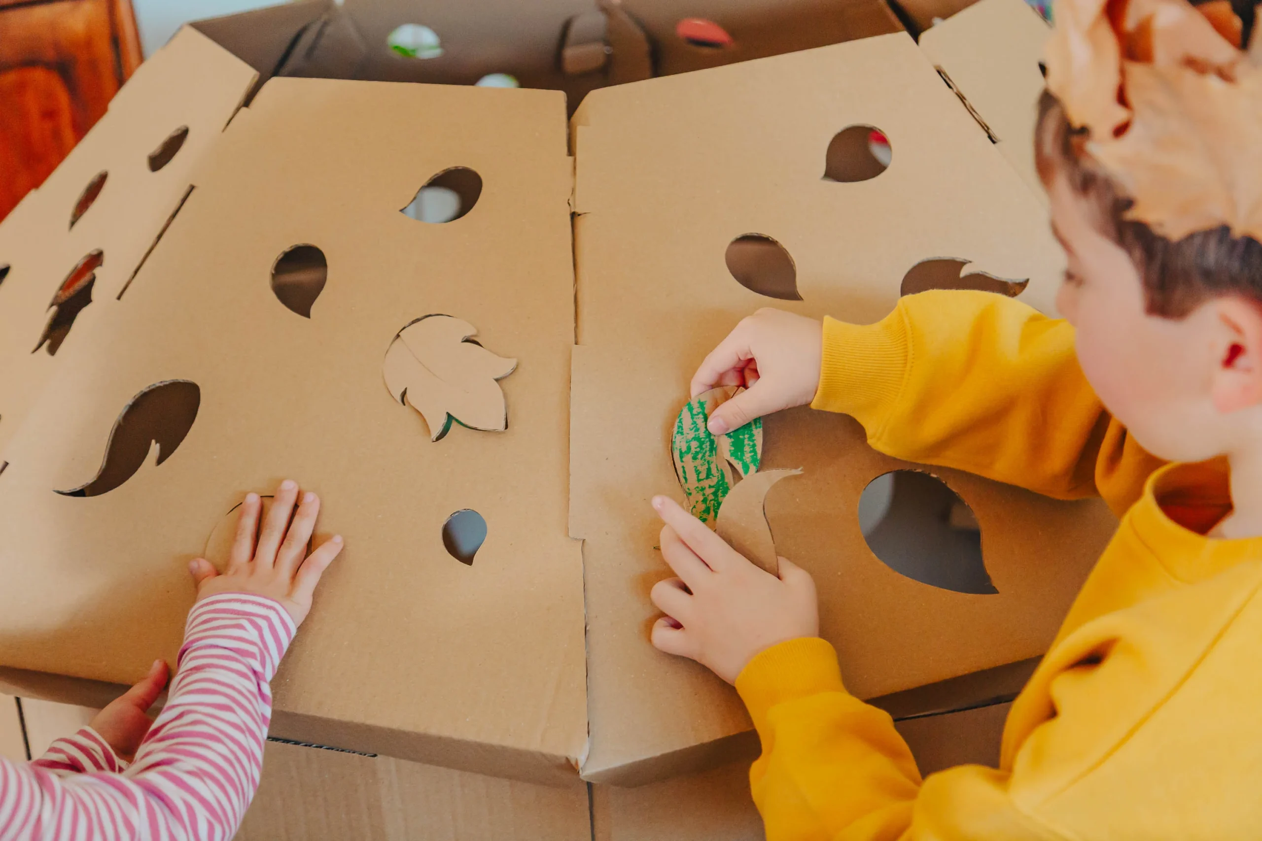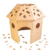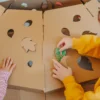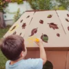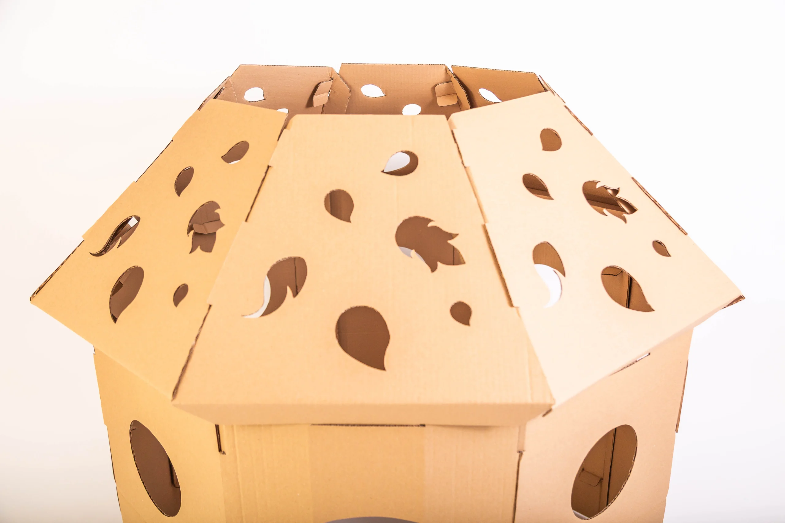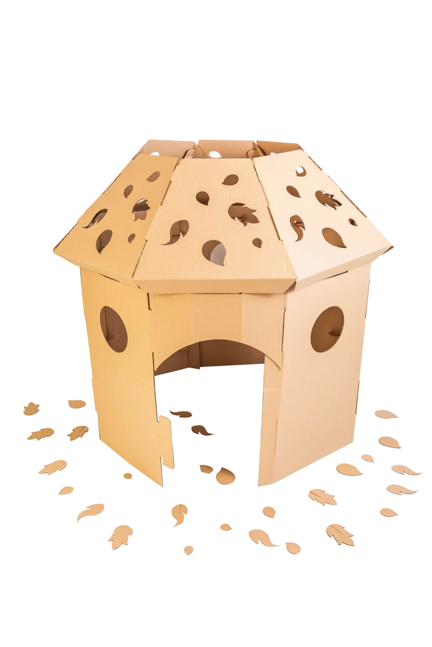 Se puede armar al interior de la casa o al aire libre. Está elaborada con cartón corrugado café de 6 mm de espesor, resistente y perfecto para ser pintado con lápices o témperas.