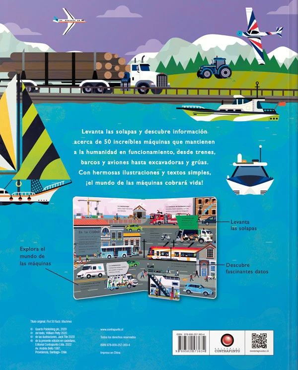 Más de mil aviones despegan cada día de los aeropuertos más activos del mundo, así como también variados tipos de máquinas ayudan a que todo funcione correctamente en cada uno de estos terminales aéreos.Mientras tanto, en otro lugar de la ciudad, una obra de construcción está repleta de máquinas que hacen mucho ruido mientras cavan, perforan y mueven la tierra.Asimismo, como la mayor parte de la tierra está cubierta de agua, las embarcaciones marítimas han sido utilizadas como medio de transporte durante miles de años. ¿Lo sabías?Este libro te invita a levantar las solapas y descubrir muchísimos datos acerca de 50 increíbles máquinas que mantienen a la humanidad en funcionamiento: desde trenes, barcos y aviones hasta excavadoras y grúas.Incluye hermosas ilustraciones, textos cortos y de muy fácil lectura.