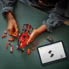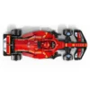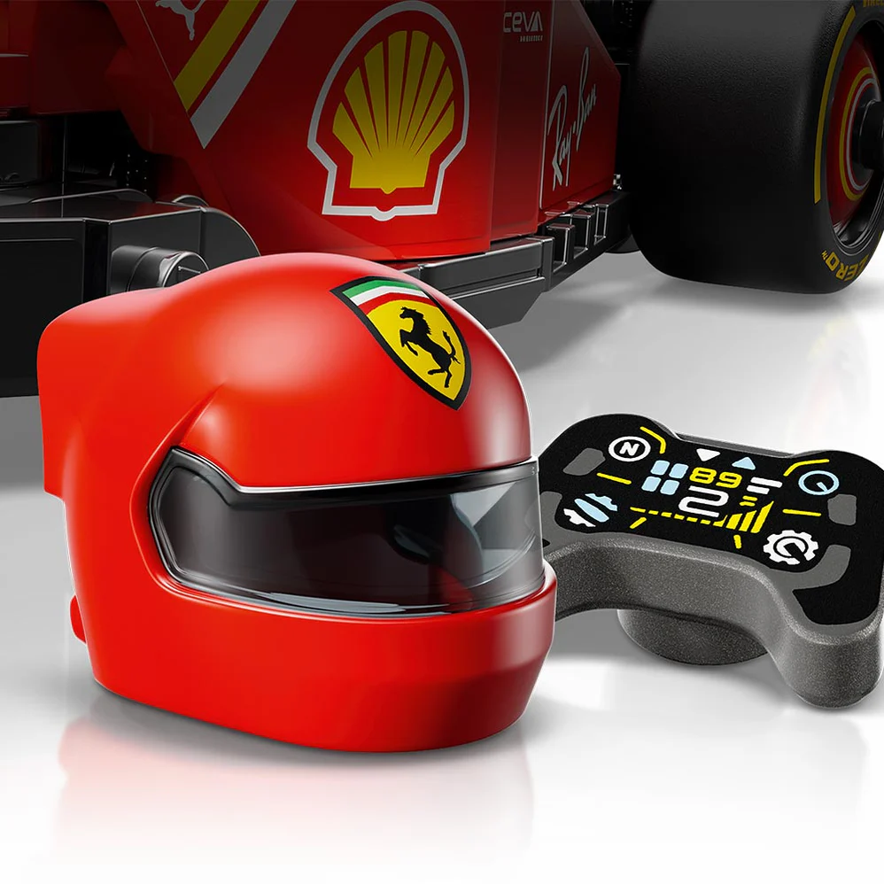 La maqueta del auto de F1 cuenta con habitáculo (al que accedes levantando el halo), alerón trasero, suspensión de doble horquilla, pegatinas de los patrocinadores y neumáticos traseros más anchos con la inscripción “Pirelli”. Viene con una minifigura de un piloto con traje de competición de Ferrari y casco con alas.