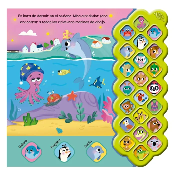 Los niños aprenderán mientras escuchan los sonidos de los animales a la hora de dormir. Imágenes y escenas divertidas para buscar y encontrar: animales de la granja, la selva y océano. Podrán pulsar el botón y escuchar los sonidos que acompañan la historia.