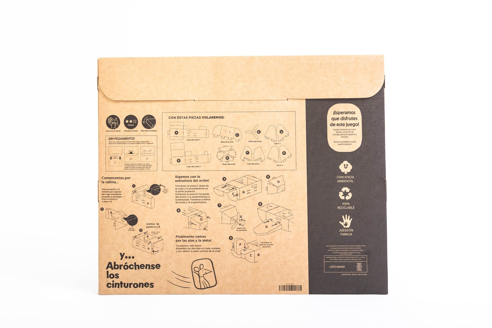 - Cada pack incluye: Piezas para armar, manual de instrucciones y diploma para los niños por haber reciclado su juguete de cartón
