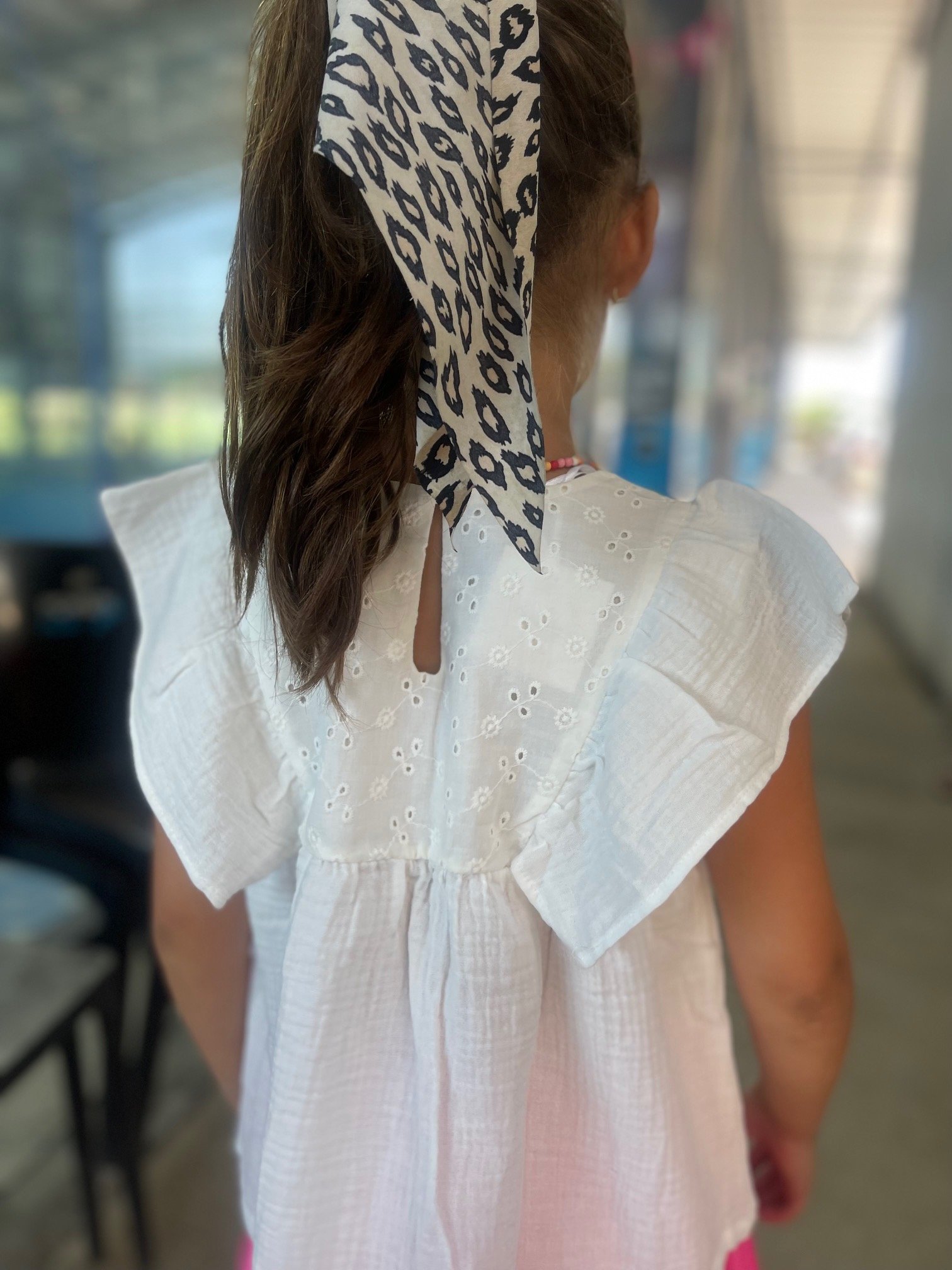 Blusa sin mangas confeccionada en suave muselina y aplicación en brodery 100% algodón, una tela liviana, transpirable y perfecta para los días cálidos, sus vuelos que abrazan los hombros le da un movimiento y un toque femenino.
