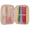 El bonito estuche ya está relleno y ofrece suficiente espacio para todos los lapices, utensilios de dibujo y lo que tu hijo necesita en la escuela. Incluye 9 lápices de colores finos, tijeras, goma de borrar, un sacapuntas doble y una regla. Además, incluye un estuche extra que ofrece aún más espacio y se puede fijar al estuche con un cierre de velcro. Está disenado en color rosa y perritos.