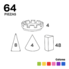 • Número de piezas: 64 piezas curvas magnéticas que permiten la construcción de estructuras en 2D y 3D.