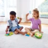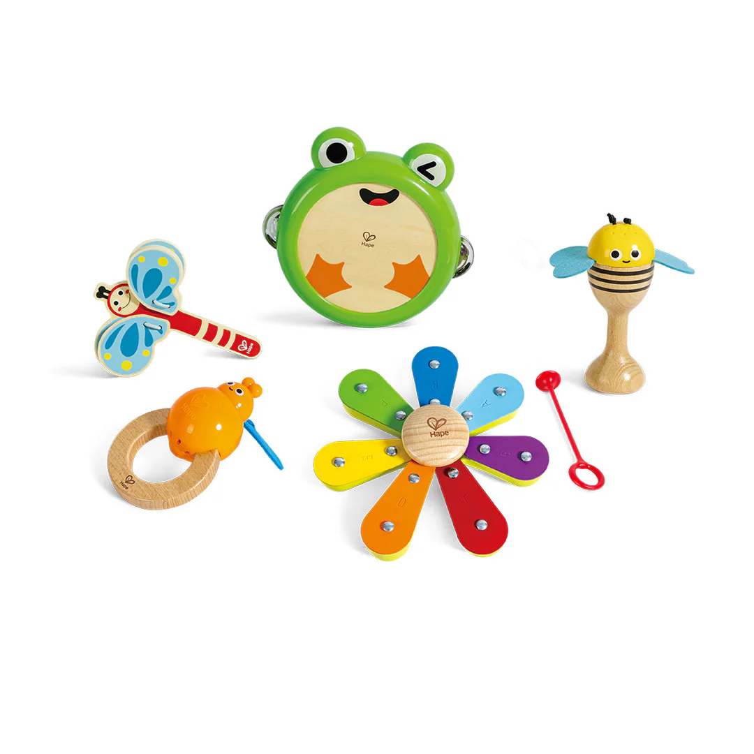 Estos juguetes de percusión estimulan los sentidos táctil, auditivo y visual Este set incluye una mariposa de castañuelas, una maraca de abeja, una campana de luciérnaga, un xilófono de flores y una pandereta de rana. + 2 años