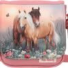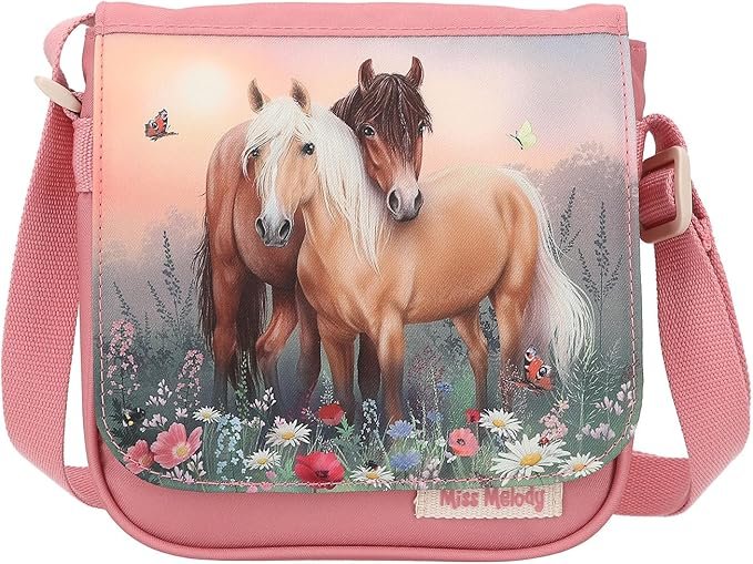 Bolso bandolera de Miss Melody color rosa empolvado lleva en la solapa (con cierre magnético) la imagen de dos caballos sobre una pradera con flores.