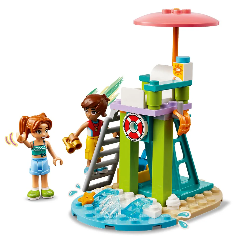 Este set LEGO de socorrismo cuenta con 2 motos acuáticas de juguete que los peques utilizarán para interpretar la historia. Leo está de guardia en su torre de socorrista y usa los prismáticos para estar atento a cualquier cosa que suceda en el océano. También es el mirador perfecto para avistar delfines. Más tarde, su amiga Candi y él echan carreras en sus motos acuáticas. A los niños les encantarán los pequeños detalles, ¡como el cangrejo que roba polos de la nevera!