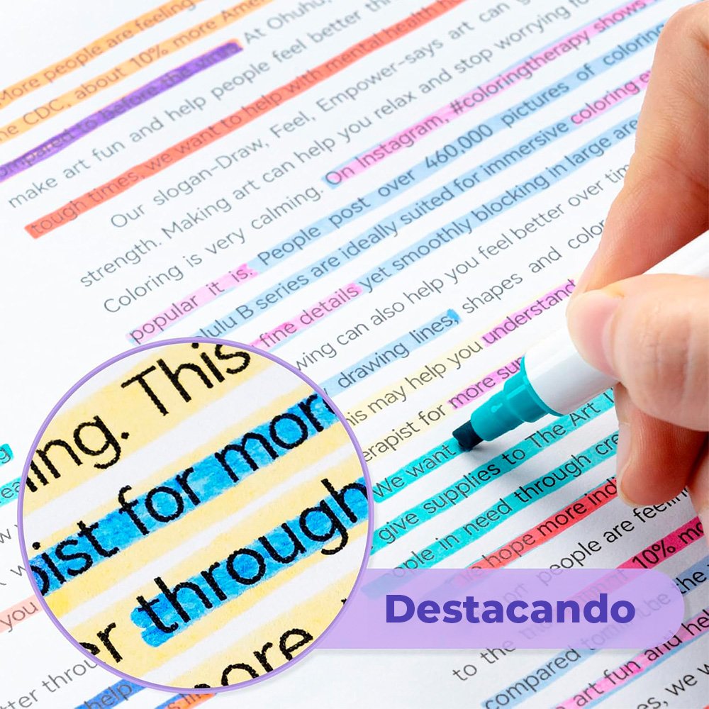 Estos resaltadores a base de agua no se traspasan en la mayoría de papeles, lo que los hace ideales tanto para escritura artística como para organización académica o profesional. Úsalos para mapas mentales, tarjetas, ilustraciones o simplemente para darle vida a tus ideas.