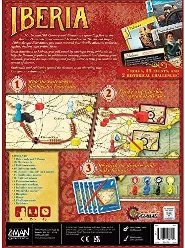 En Pandemic: Iberia, tú y tus amigos son parte de la Segunda Expedición Filantrópica Real que debe encontrar una manera de detener la propagación de 4 enfermedades históricas en la Península Ibérica en la España del siglo XIX. Forme un equipo en Pandemic: Iberia para combatir estas enfermedades históricas mientras trata a los pacientes, limpia el suministro de agua y construye la red ferroviaria más eficiente entre hospitales para garantizar la seguridad de la población. ¿Pueden usted y su equipo detener la propagación a través de Iberia?