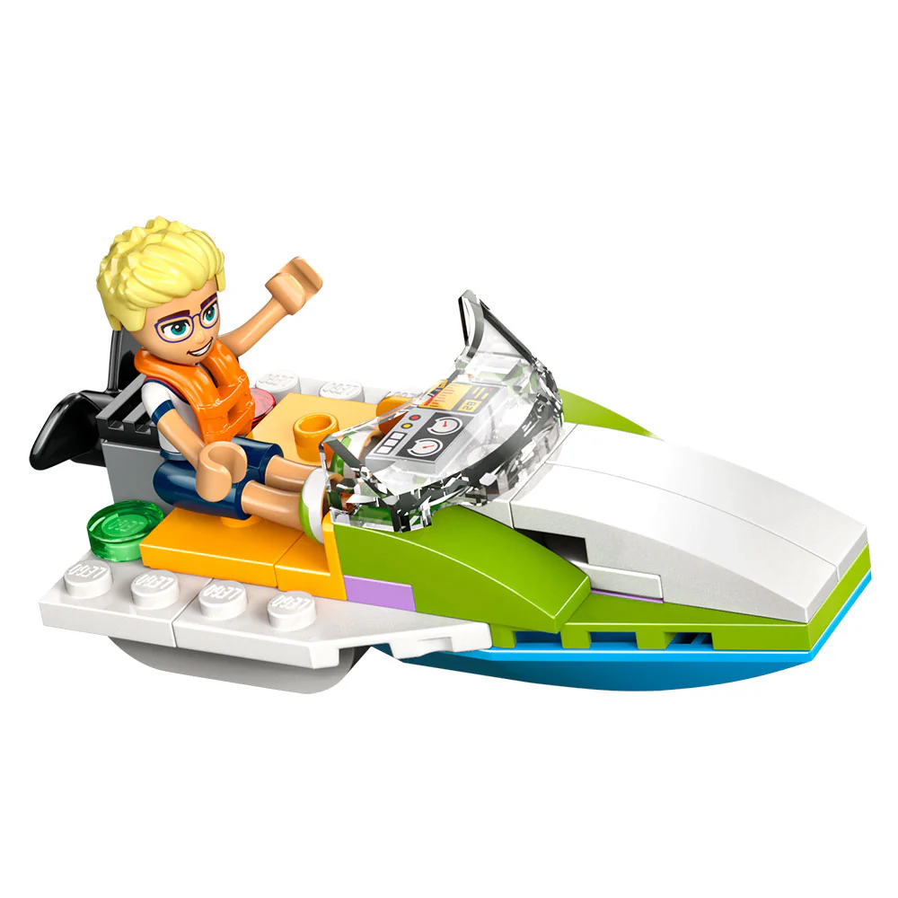 - Construye y luego reconstruye: El set incluye una escena playera con un hidroavión, una zona de esparcimiento y un kiosko de playa que se convierte en una nueva escena con una lancha motora, una zona exterior con asientos y una pizzería.