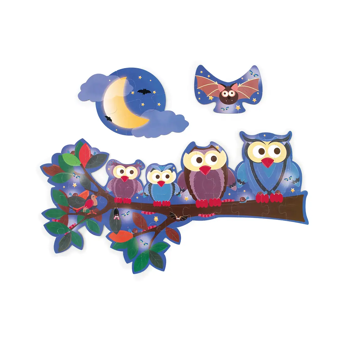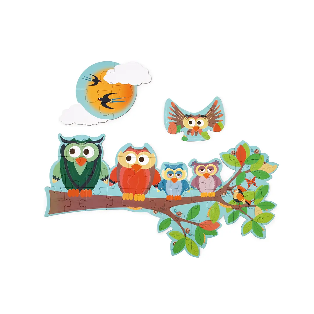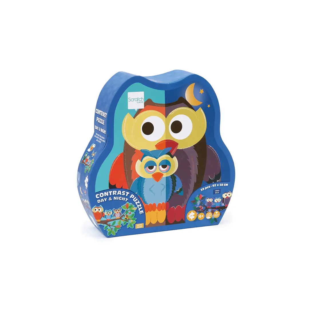 Novedoso puzzle doble de 39pcs con forma y diseño de búho, podrás armar 3 puzzles, cada uno impreso por ambos lados, por un lado es de día y por el otro de noche! Tamaño del puzzle armado 63 x 40 cm. Hecho en cartón altamente resistente. Edad Recomendada +3 Años