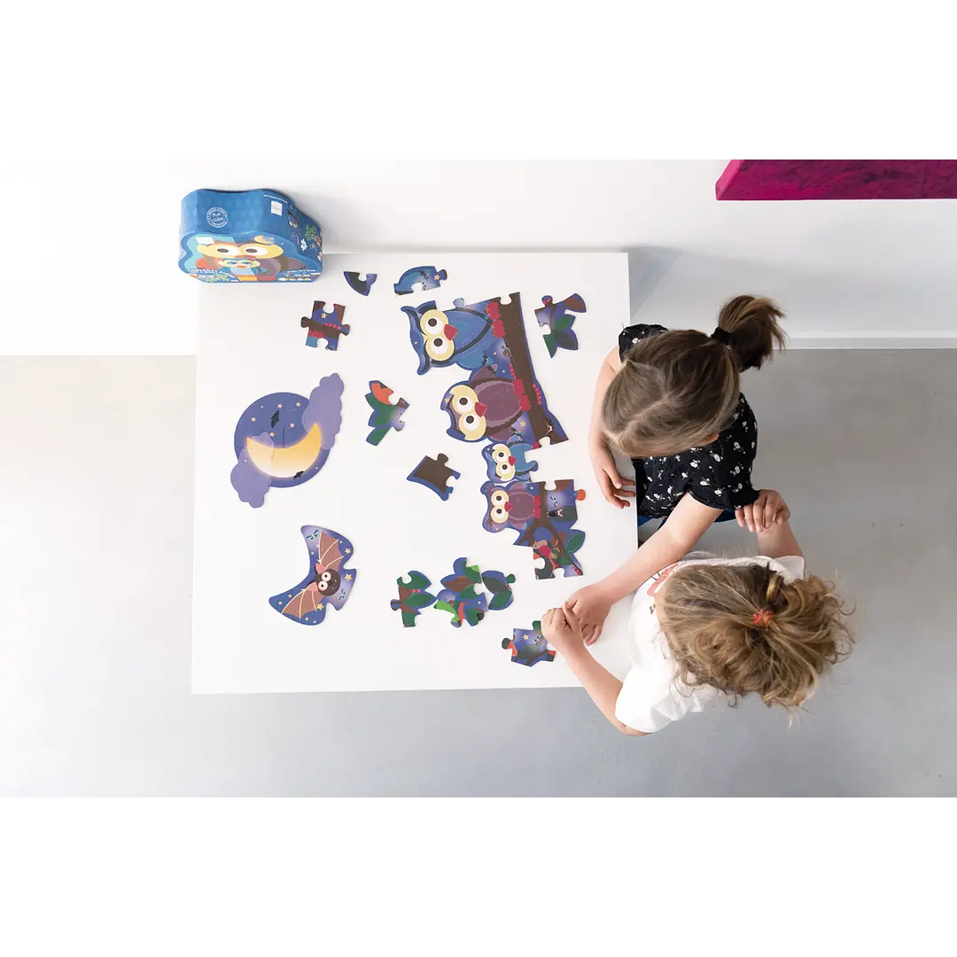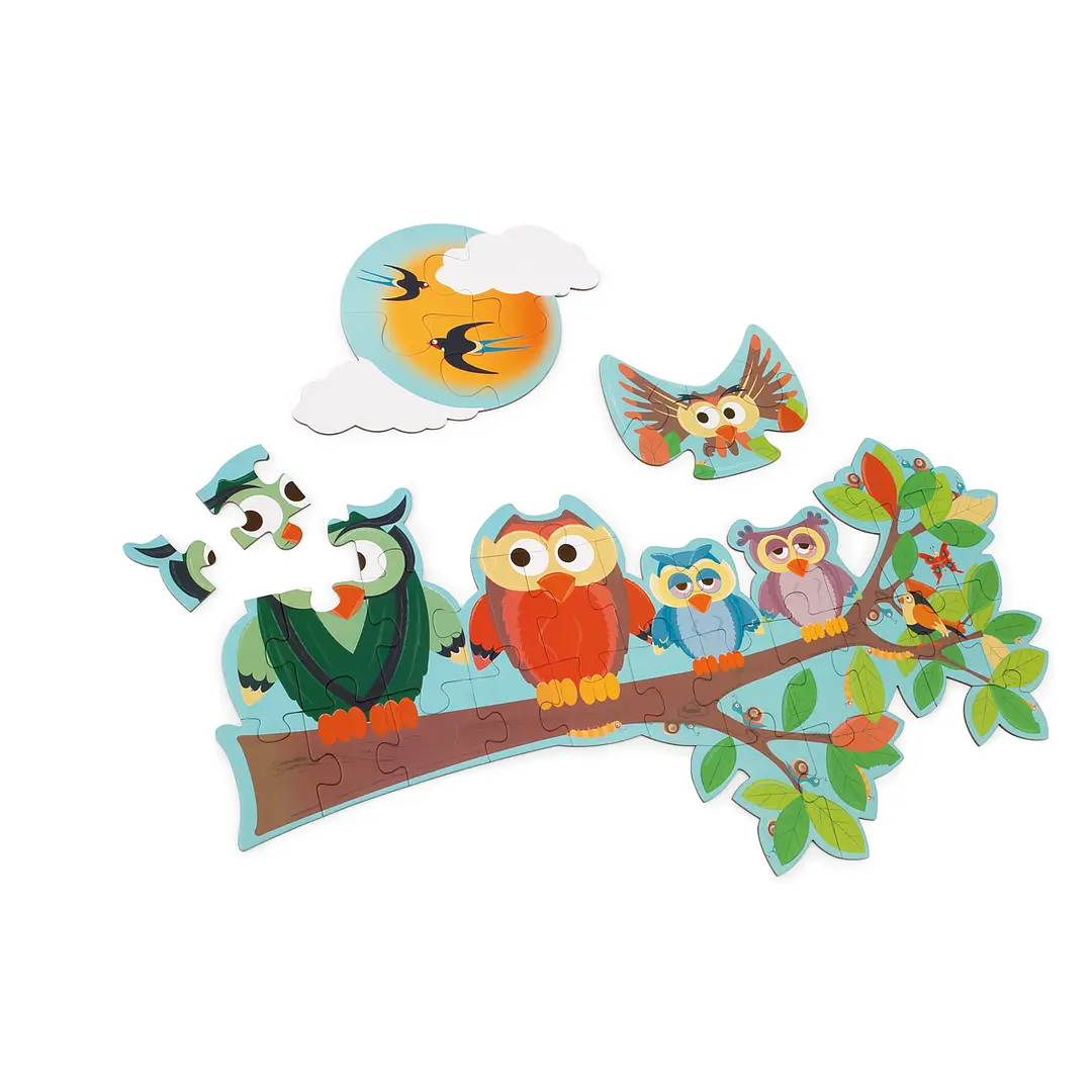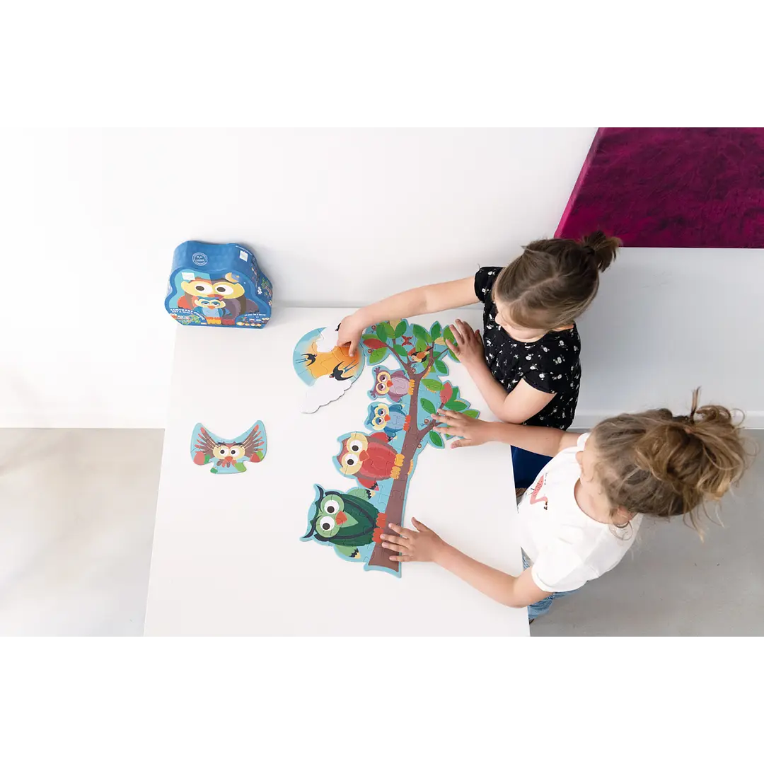 Novedoso puzzle doble de 39pcs con forma y diseño de búho, podrás armar 3 puzzles, cada uno impreso por ambos lados, por un lado es de día y por el otro de noche! Tamaño del puzzle armado 63 x 40 cm. Hecho en cartón altamente resistente. Edad Recomendada +3 Años
