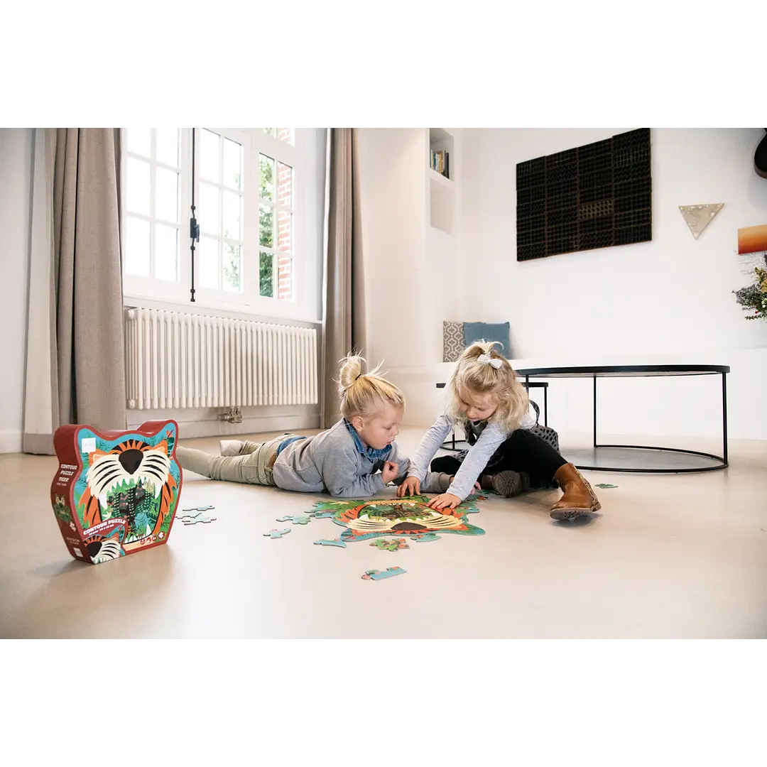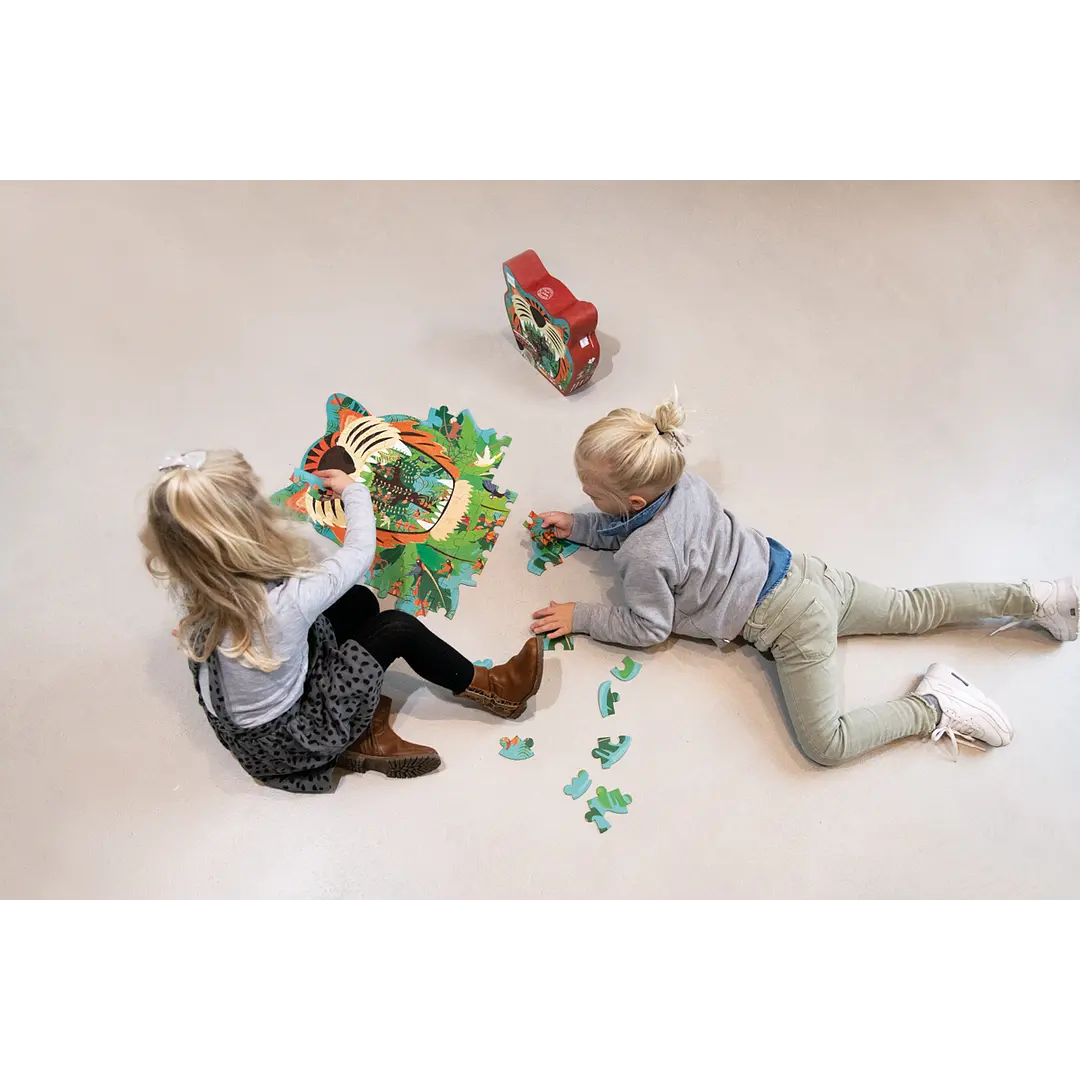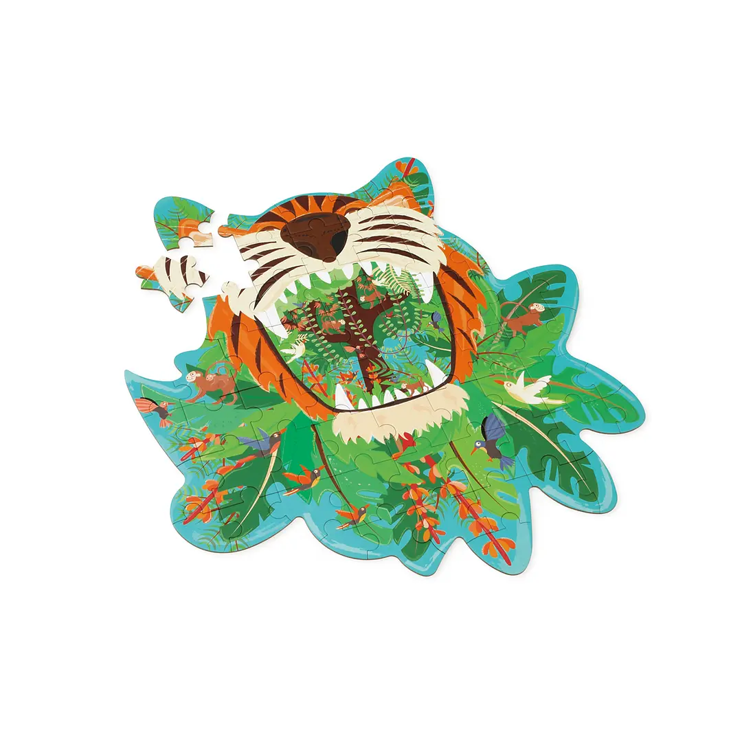 Increíble puzzle de 59 pcs, con forma y diseño de tigre. Tamaño del puzzle armado 53 x 56 cm. Hecho en cartón reciclado e impreso con tintas en base a soja. Edad Recomendada +4 Años