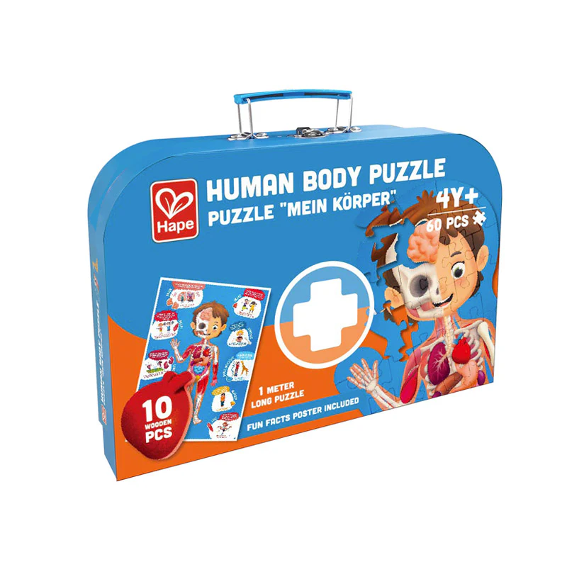 Aprende cómo funciona tu cuerpo con este divertido puzzle ¡de 1 metro de largo! Un puzzle de 60 piezas, acompañado de 10 piezas de madera formadas por huesos, músculos, el corazón y otros órganos para completarlo. Un puzzle original y educativo, presentado en una bonita caja maletín y acompañado de un póster con datos curiosos sobre le cuerpo humano. Edad: +4 años