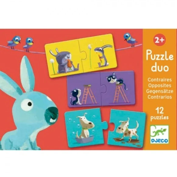 Con estos sencillos y educativos puzzles, los pequeños tendrán que encajar cada animal con su opuesto: un perro sucio y uno limpio, el gato abajo de la escalera y el que está arriba, y así sucesivamente, con distintos animales lindos y coloridos. Son 12 puzzles para divertirse.