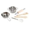 Set de cocina que incluye olla, sartén, batidor de metal, uslero y utensilios de madera. Estimula el juego imaginativo, juego de roles y la creatividad.