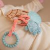 Estos tres bonitos cordones de algodón presentan elementos suspendidos para estimular los sentidos: un susurrante caparazón de tela, un anillo de colores y un suave peluche de Emilia la Tortuga.