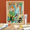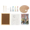 Contenido: 1 lienzo impreso con el contorno de la ilustración a pintar (formato 290 x 220 mm) 4 tubos de pintura acrílica 1 paleta de madera 3 pinceles 1 soporte para pinceles 1 marco de madera 1 plantilla a seguir Un folleto y una tarjeta con un código QR que conduce a un video tutorial de la actividad.