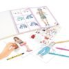 ¿Listas para crear looks maravillosos? Este set de dibujo de TOPModel se compone de: cuaderno de 76 páginas (parcialmente coloreadas), 2 hojas desplegables con plantillas de dibujo de colores, 2 hojas de pegatinas y los imprescindibles para diseñar (10 lápices de colores, 4 rotuladores de gel (oro, plata, rosa y lila), 1 lápiz para borrar).