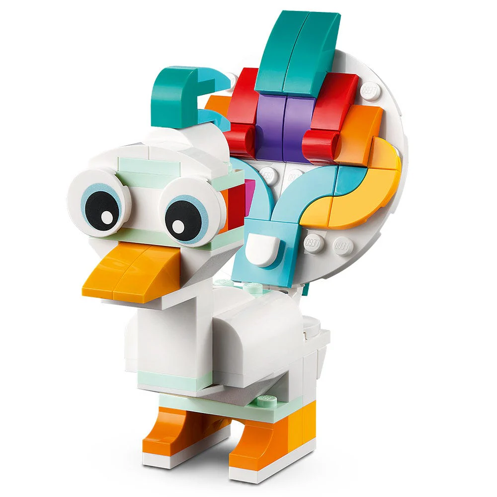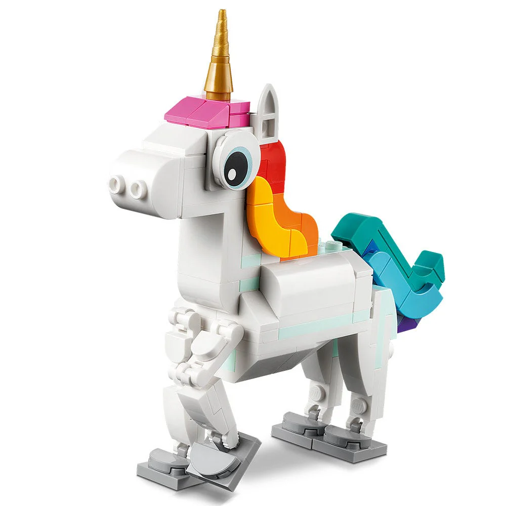 Los niños imaginativos a partir de 7 años se transportarán a una tierra mítica llena de fascinante acción con el set de construcción 3en1 Unicornio Mágico (31140). Contiene un unicornio de juguete con cuerno dorado, vistosa cola, y patas y cascos articulados. Puedes colocarlo en 2 posturas: sobre las 4 patas o sosteniéndose sobre las 2 traseras en una inconfundible pose, expuesto en la base arcoíris del set.