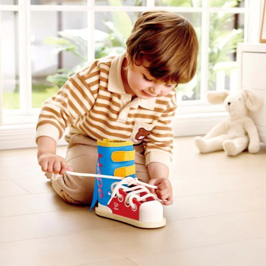 Este juguete educativo ayuda a los niños a aprender a abrocharse los cordones mientras se divierten. Diseñado para enseñar a atarse los cordones, subir cremalleras y abotonarse, presenta a los niños tareas de la vida real de forma interactiva. Al practicar botones a presión, velcro y cordones, los niños desarrollan la motricidad fina, su independencia y confianza. Edad: 3 – 8 años